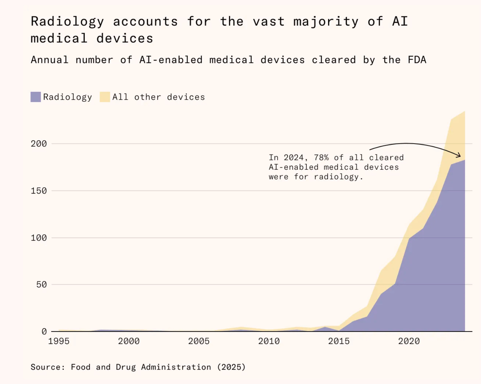 Radiology was one of the first fields which Geoffrey Hinton thought would be dis-intermediated by AI as early evidence seemed to clearly indicate that AI could scrutinise X-rays with greater accuracy and more consistency than a skilled human radiologists. And yet, today there are more jobs openings for these radiologists than ever before, despite widespread diffusion of AI imaging into the field. This post explains why and the main points I think will apply for many other professions - the job is more than the task (of reviewing images), AI performance significantly degrades outside test conditions (training lacks full context), legal liability (somebody got to be legally accountable) and AI is augmentative, meaning more screenings for which there is actually far more hidden demand now that supply has increased. This is a great example which fortifies the AI Optimists narrative. Must read.