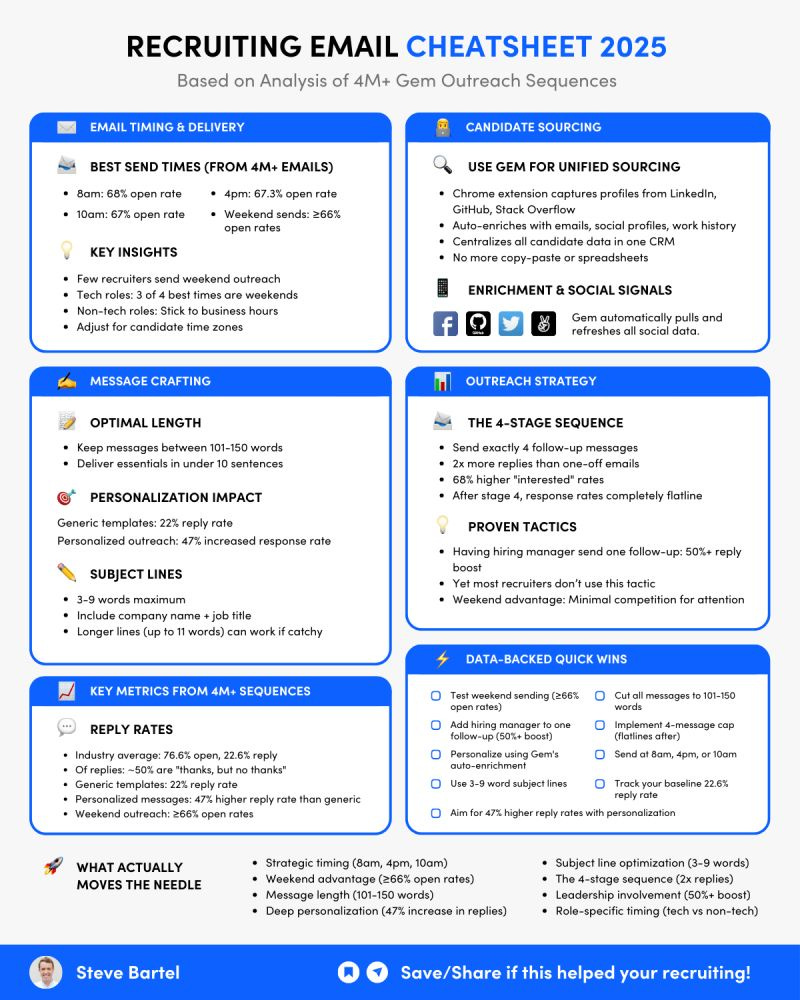 Love this one pager from brainfooder and GEM CEO Steve Bartel. We all know that finding candidates is one thing, but getting them to engage with you is another. Proprietary data on on what email / messages work - character count, timing, frequency. Note the stat on ‘leadership involvement’ - 50%+ boost in response. Useful immediately but also portentous for who ends up doing the engaging at the end of the day.