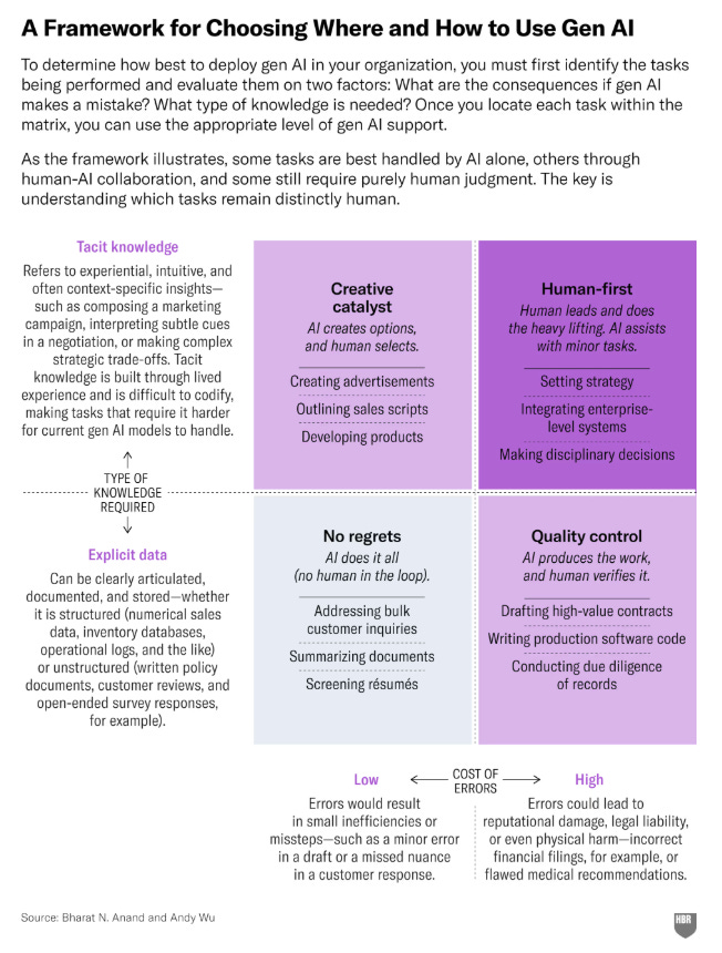 Some good thinking in this article, which introduces a framework on how to decide where and when to deploy GenAI into the workflow. The frameworkâs core components are the questions: what is the cost of error? + what is the type of knowledge (tacit knowledge vs explicit data), which can be conveniently represented into a classic 2 x 2 decision matrix. Well worth a read. H/T brainfooder Ivan Harrison for the share in the online community