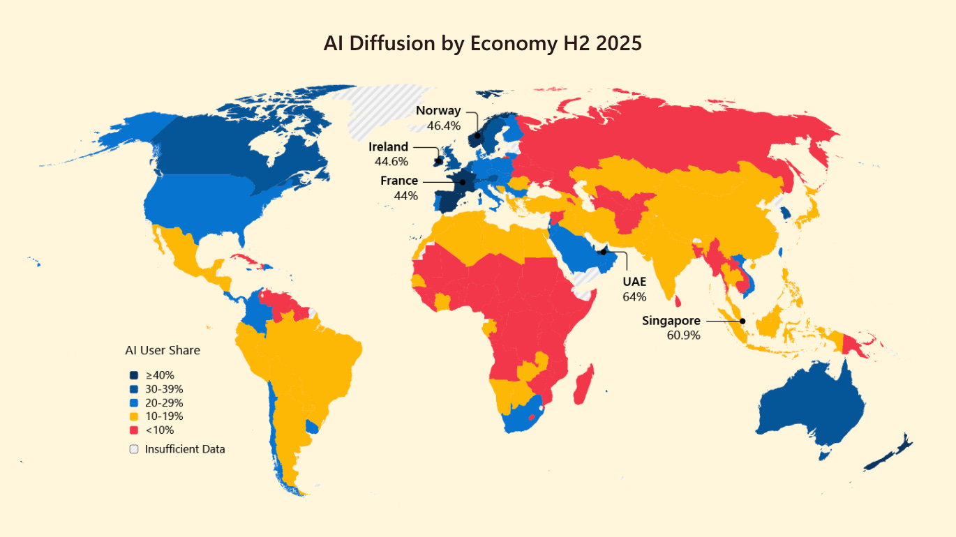 Microsoft are so dominant a technology company that they are one of the few companies which could look at internal user data and plausibly make commentary on how people worldwide are using AI. Two most interesting parts of this post are the country case studies: Both the Republic of Korea and United Arab Emirates accelerated AI adoption through national policy initiatives